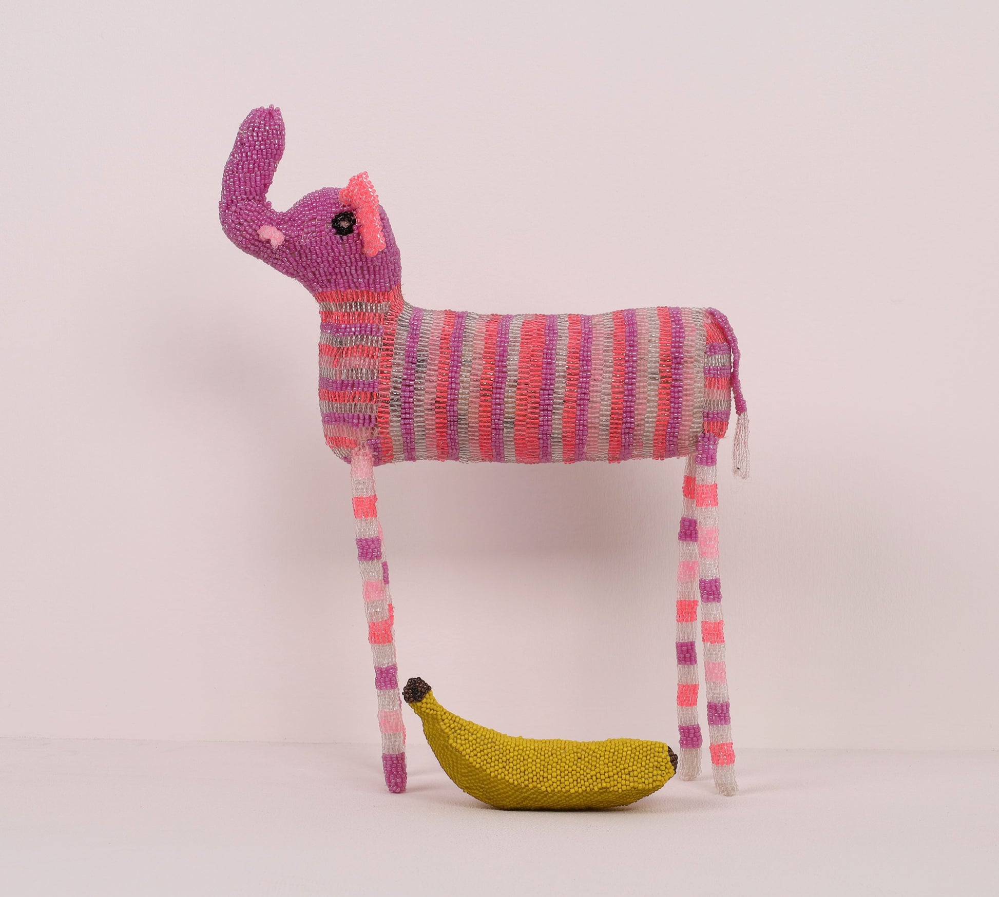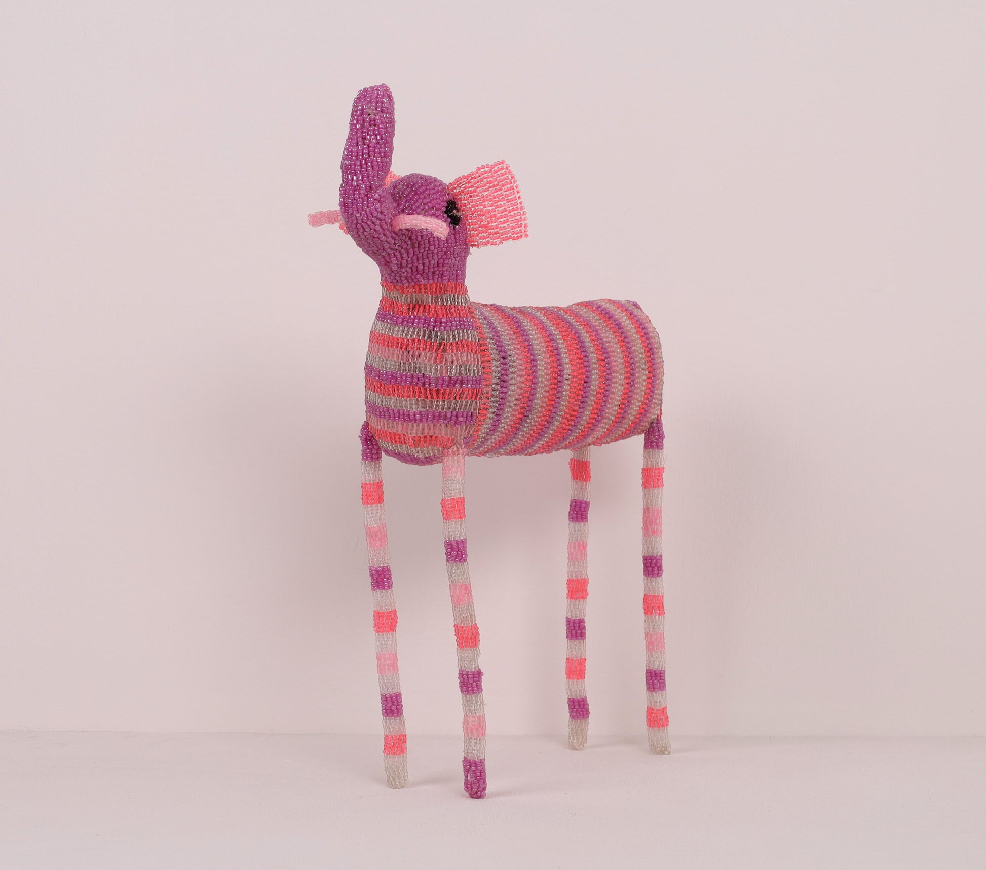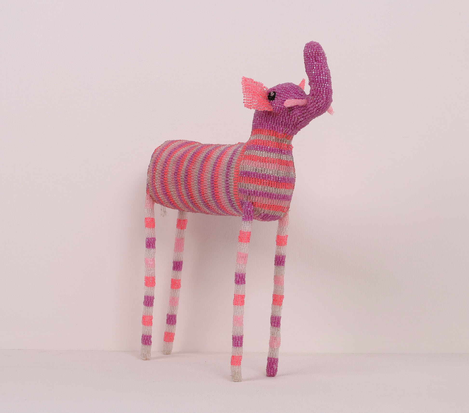 Inathi Nondolongo's striking (iconic long-legged) curious beaded elephant art is designed in a stripy pattern offered in a multi-colour palette.