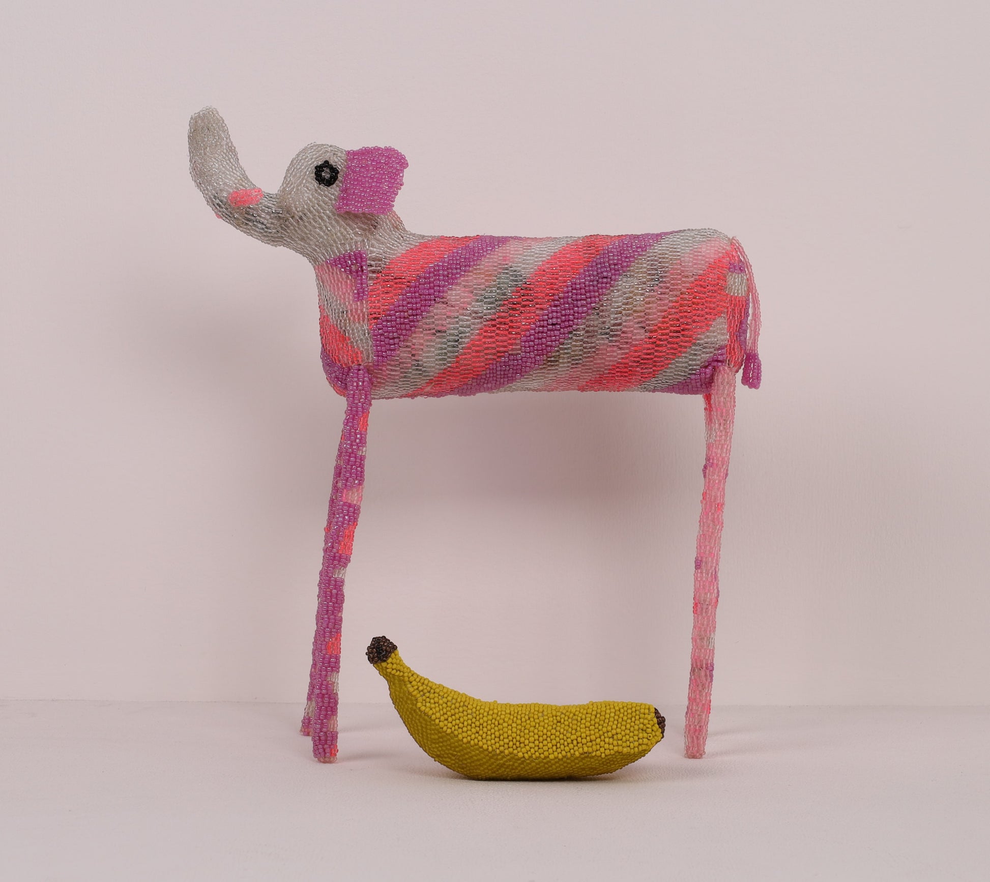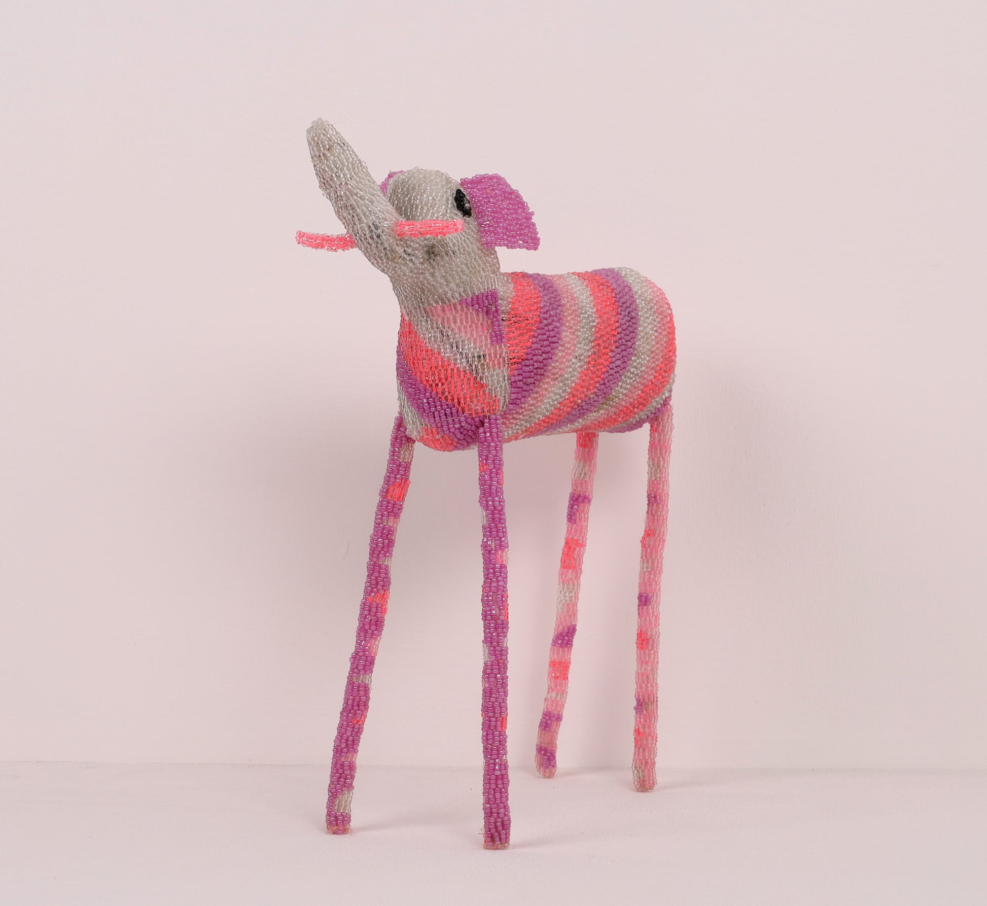 Inathi Nondolongo's striking (iconic long-legged) curious beaded elephant art is designed in a stripy pattern offered in a multi-colour palette.