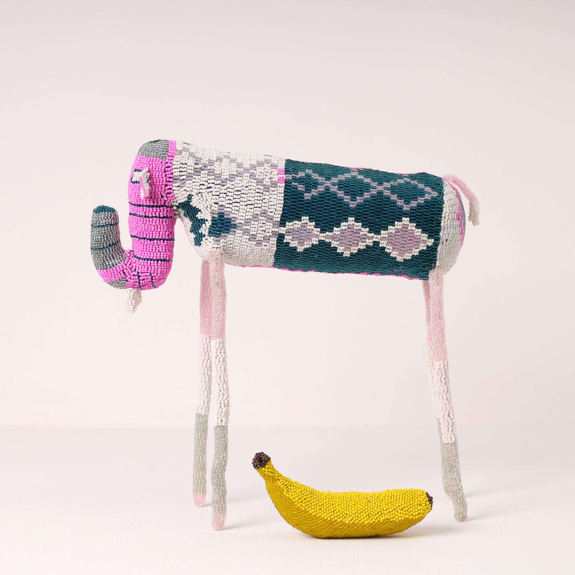 N Qoqa's striking (iconic long-legged) beaded elephant art is designed in a geometric pattern offered in a multi-colour palette.