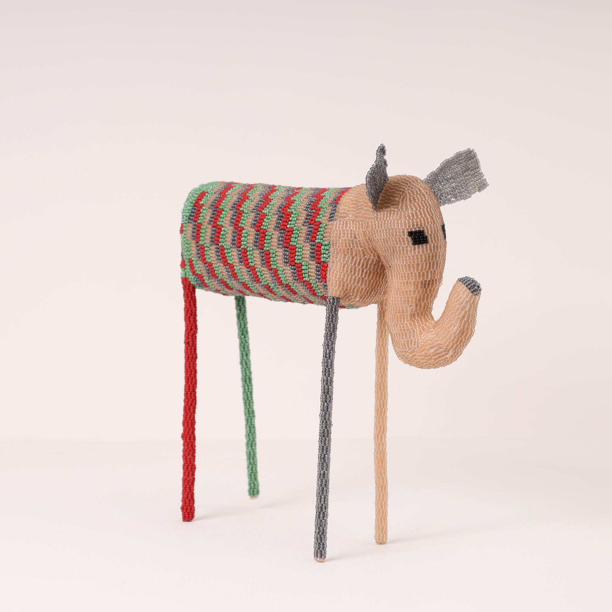 Bukelwa Tela's timid (iconic long-legged) beaded elephant art is designed in a geometric pattern offered in a multi-colour palette.