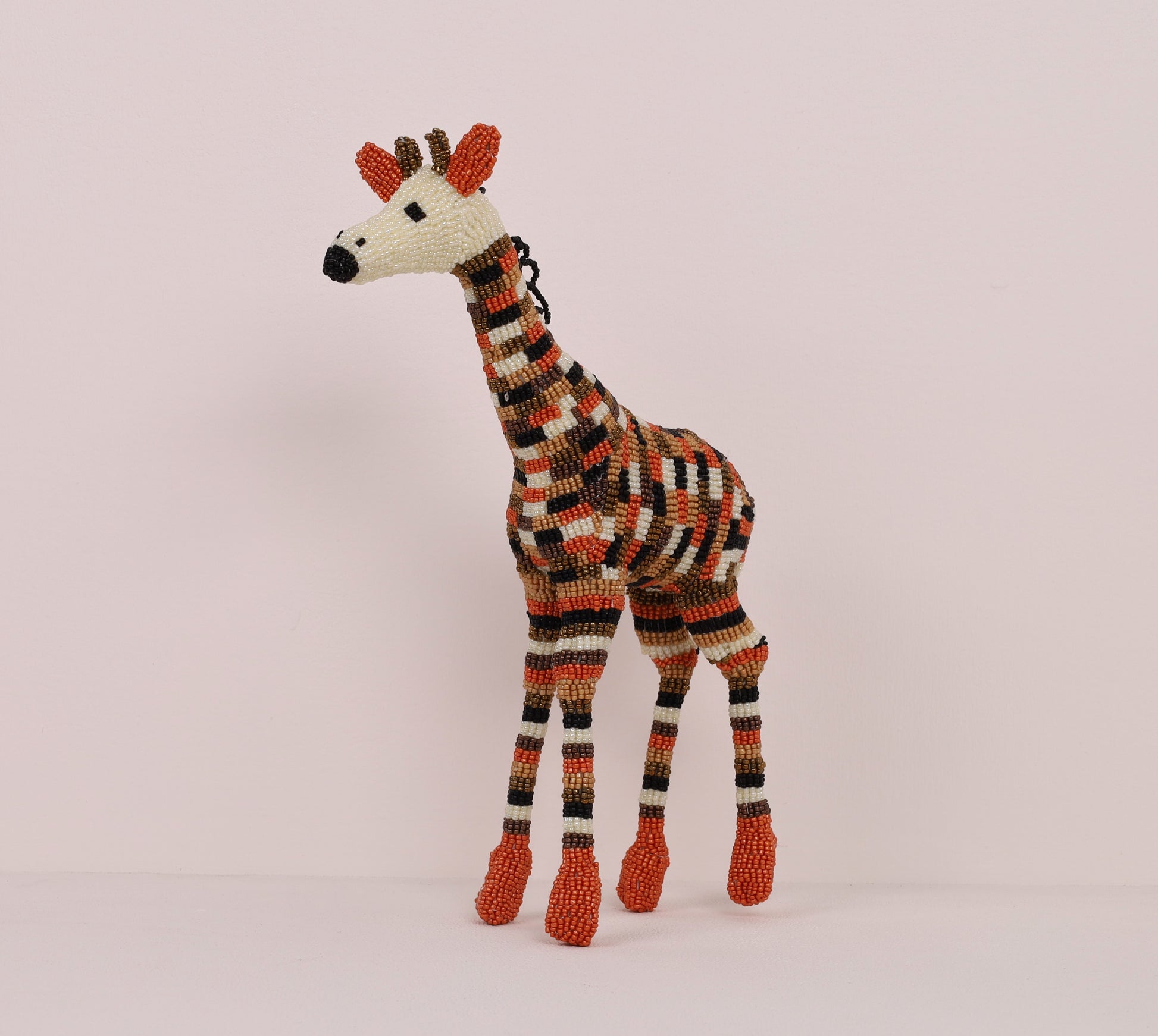 Bongeka Dyakalashe's striking beaded giraffe art is designed in a geometric pattern offered in a multi-colour palette.