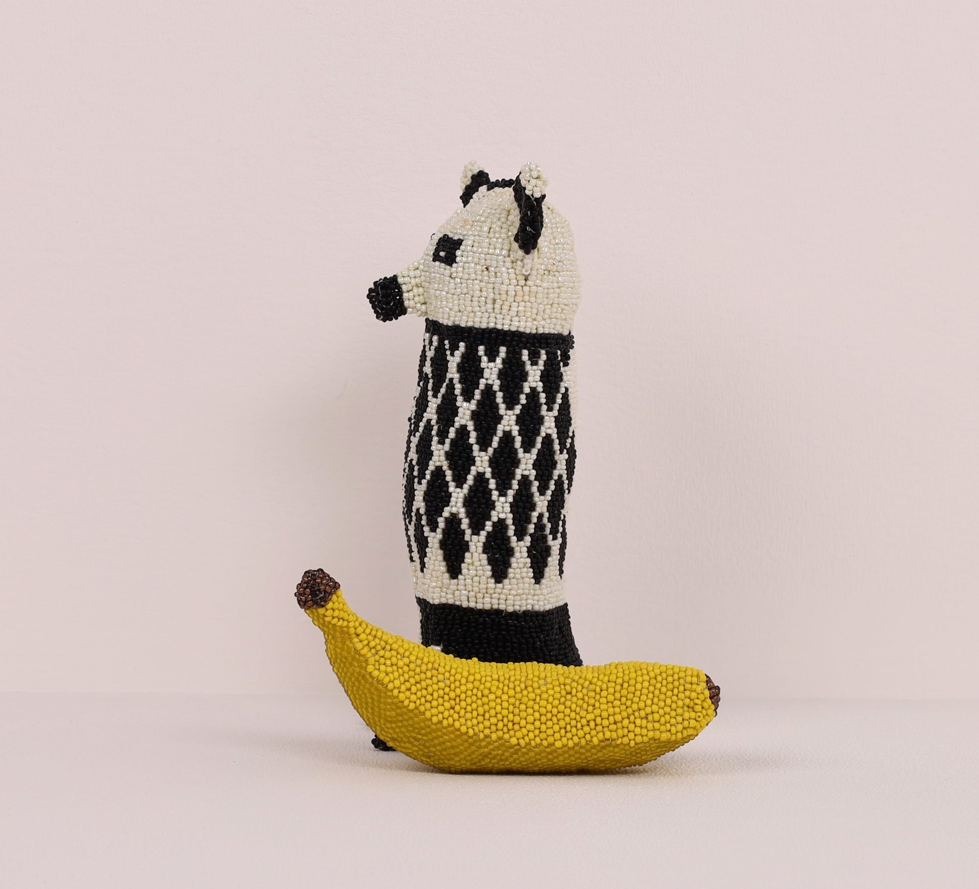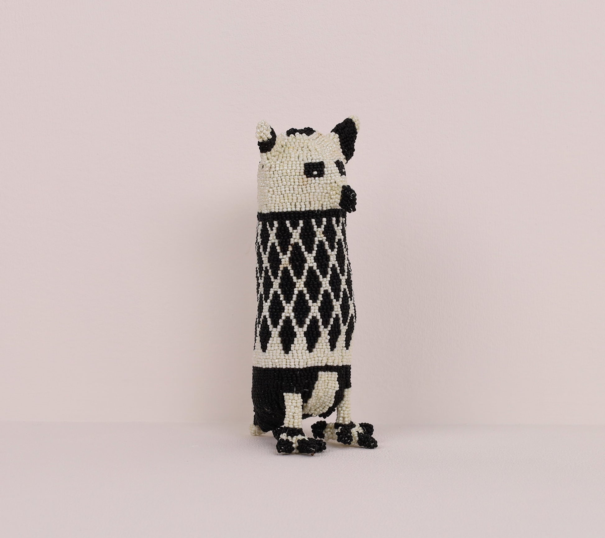 Beauty Mgudzi's curious beaded owl art is designed in a geometric pattern offered in a 2-toned colourway.