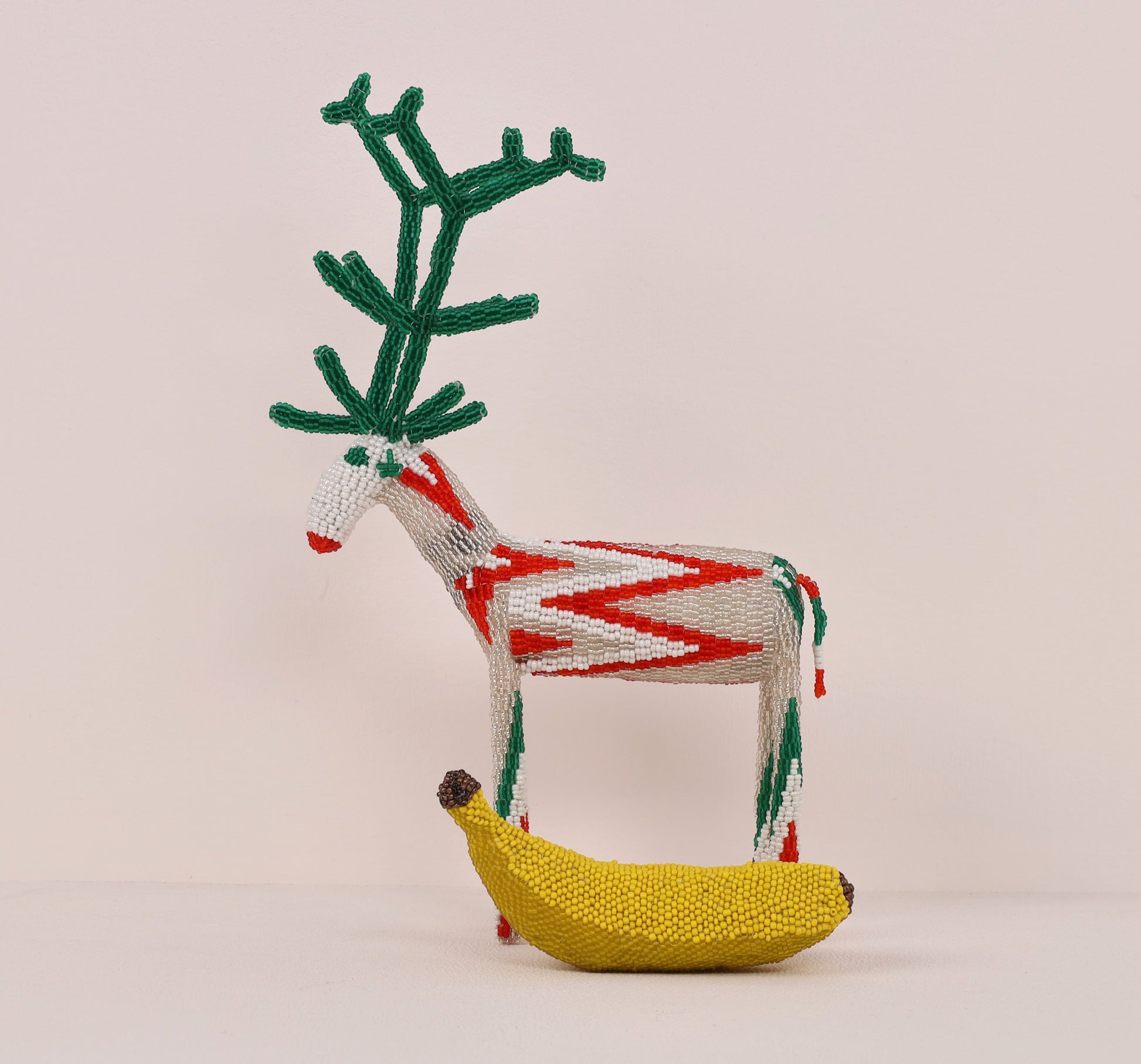 Noxolo Dyosi's striking (iconic long-legged) beaded reindeer art is designed in a zig-zag pattern offered in a multi-colour palette.