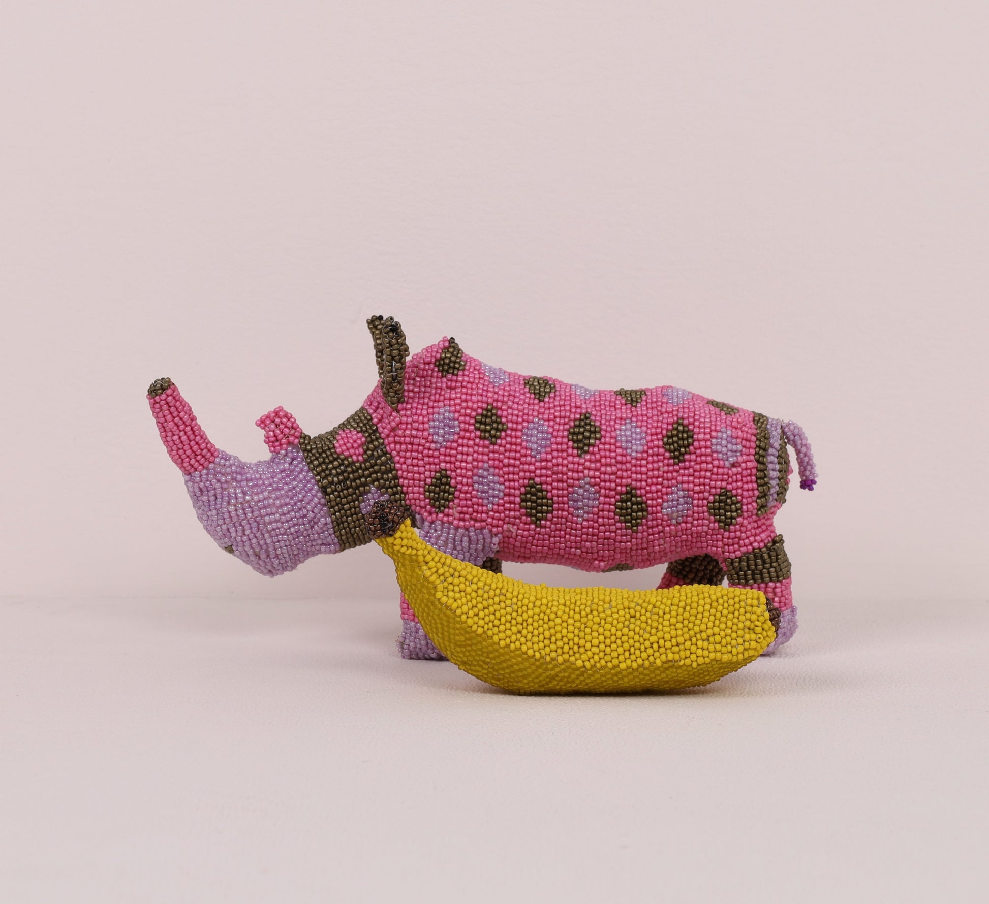 Liliza Mhombi's timid beaded rhino art is designed in a geometric pattern offered in a multi-colour palette.