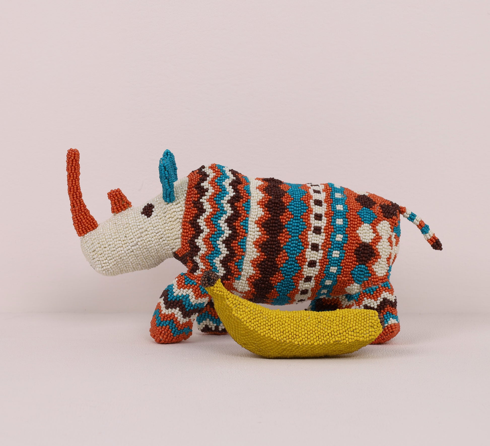 Aphelele Paji's timid beaded rhino art is designed in a geometric pattern offered in a multi-colour palette.