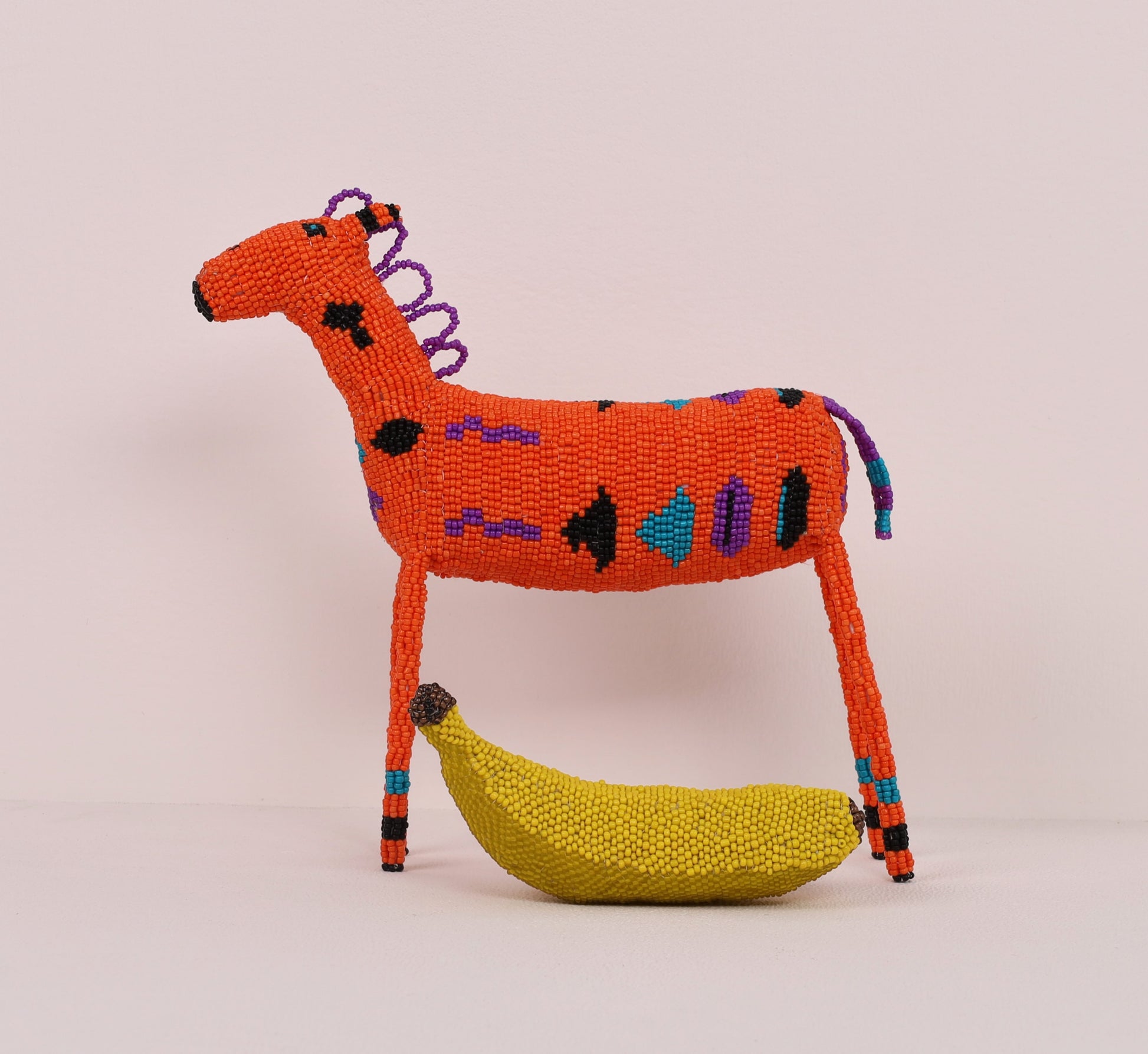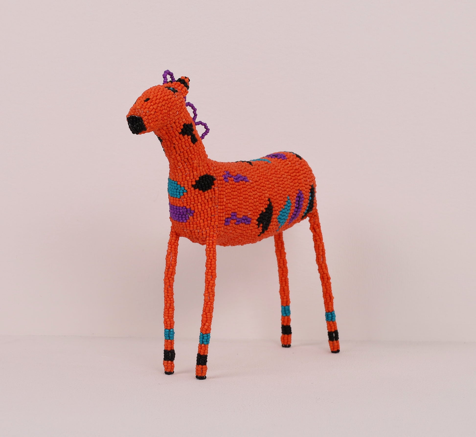 Mzamo Ntombomzi's striking (iconic long-legged) beaded zebra art is designed in a geometric pattern offered in a multi-colour palette.